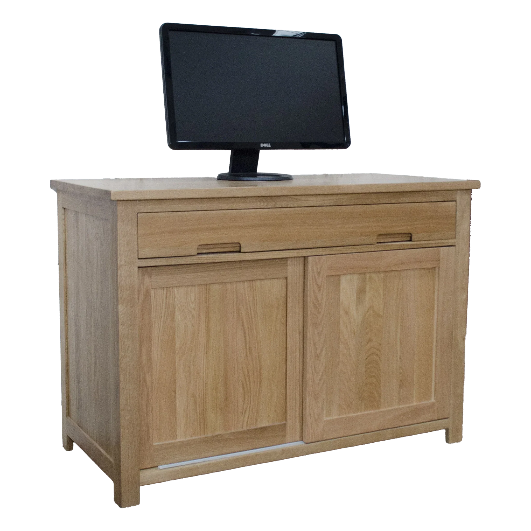 The Opus Hideaway Computer Desk is a premium addition to any home office or workspace. Crafted from 100% high-quality oak, this desk exudes elegance and sophistication. Its sleek design is complemented by a range of functional features, including a convenient keyboard tray, 2 sliding doors, hidden PC storage, and 3 internal drawers for seamless organization. The general storage space and base unit storage provide ample room for all your essentials, ensuring a clutter-free environment.