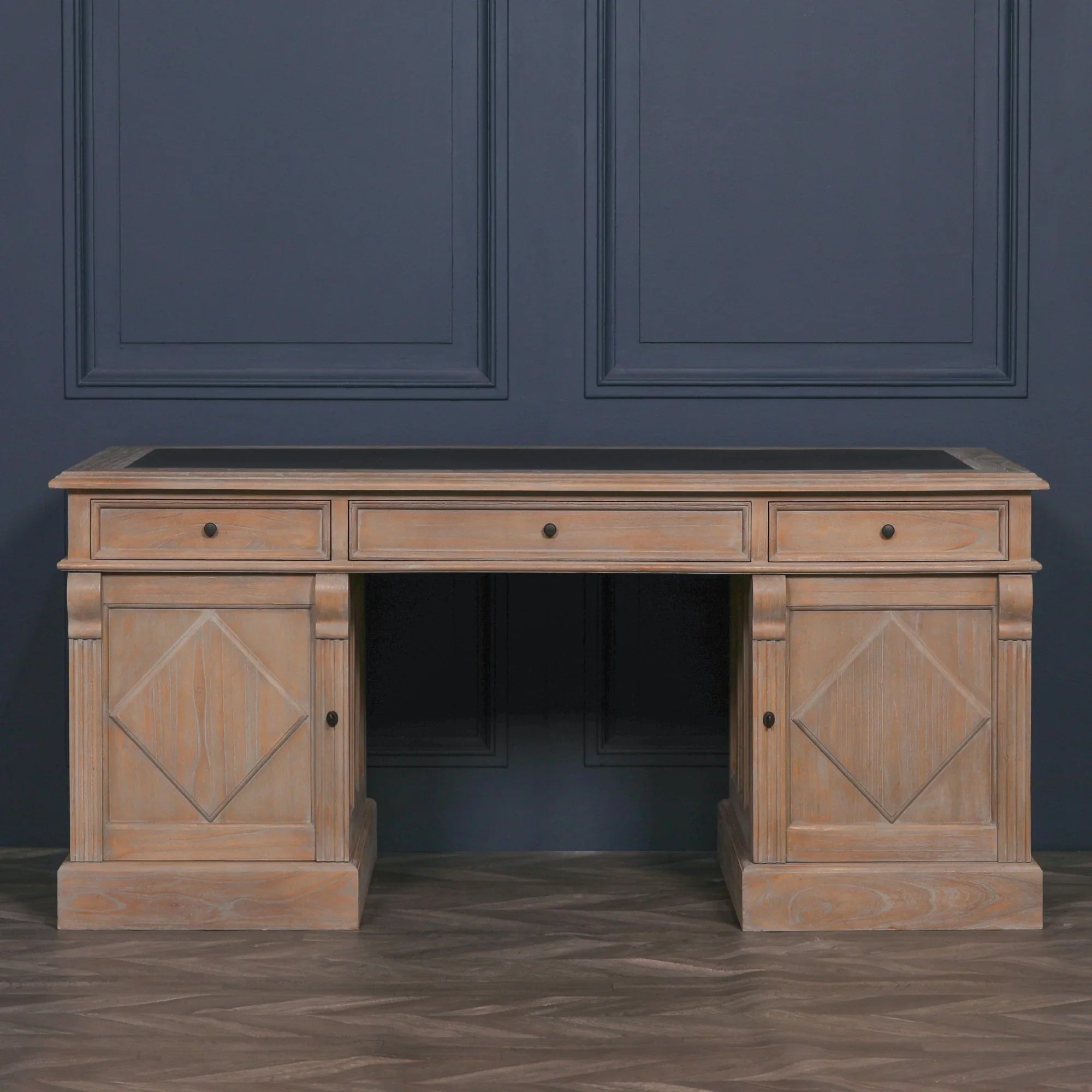 Enhance your workspace with this handcrafted Rustic Wooden Desk made from white cedar. Featuring a synthetic grey leather top and intricate carved detailing, this desk offers 3 drawers and 2 large storage cupboards with a removable shelf. Pair it with the Wooden Louis Upholstered Chair for a complete look.